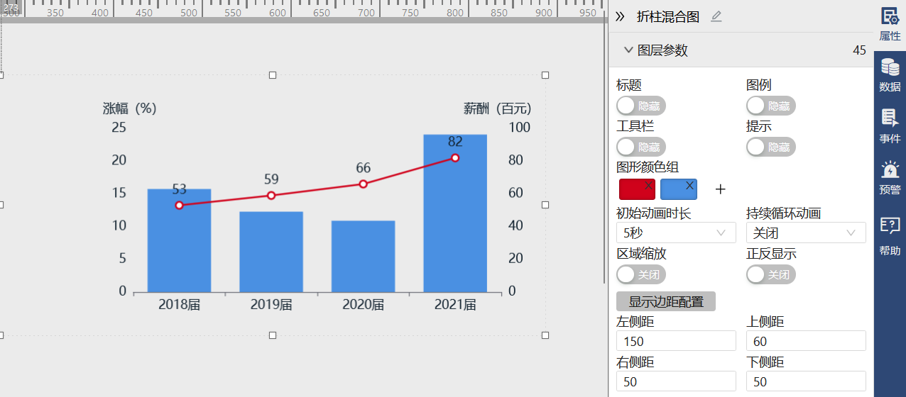 当需要动态显示数据时,可以打开折柱混合图的动画状态,其中动画时长可以根据实际情况设置,速度也可以快也可以慢。