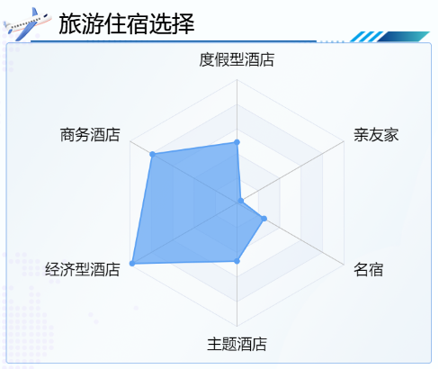 经济型国际酒店、商务型酒店发展仍是一个人们在休闲娱乐度假型旅游中最常进行选择的住宿生活方式,占比分别可以高达48.98%、39.49%,最常使用选择一些度假型酒店,主题以及酒店、民宿的分别表示只有24.62%、23.55%、12.69%,还有通过少量住亲友家1.82%或其他0.05%。