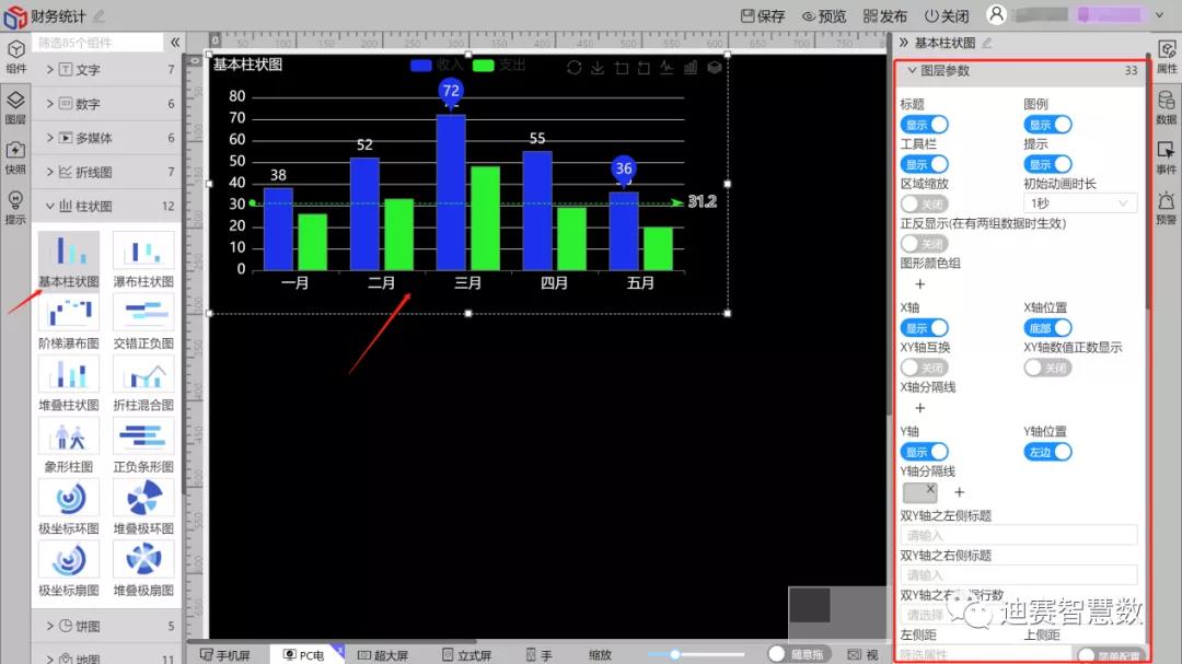 接下来我们主要通过介绍如何对柱状图组件进行属性配置以及相关数据构成。柱状图类总共有12个,今天以前5个为例。