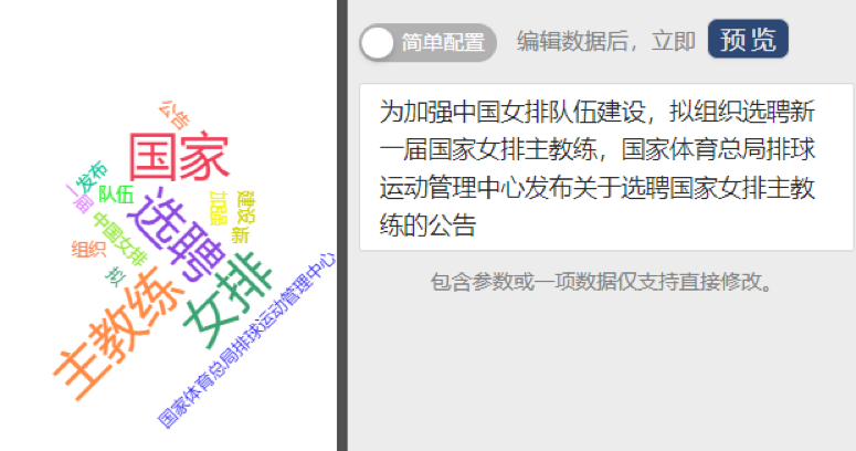 文本配置也非常简单,在右侧的数据功能中,简单的配置模式将直接粘贴到文章内容中,点击预览。